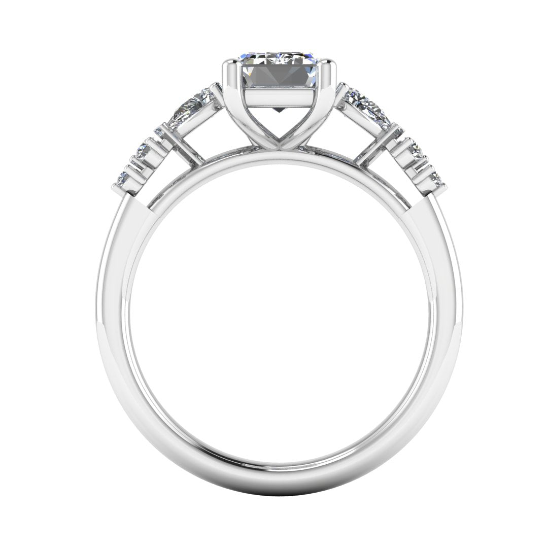 A beautifully modern take on the timeless solitaire, this elegant design showcases an emerald cut diamond at its centre, expertly set to highlight its clean lines, depth, and refined brilliance. Delicately positioned along each shoulder are pear-shaped and round brilliant cut diamonds, forming a soft, flowing silhouette that adds subtle sparkle and romantic detail to the design. The shoulder diamonds total 0.13ct, perfectly complementing the striking emerald cut centre stone.