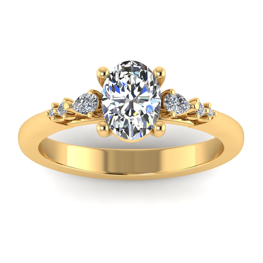 Oval Cut Solitaire with Pear & Round Diamond Shoulder A beautifully modern take on the timeless solitaire, this exquisite design showcases an oval cut diamond at its centre expertly set to maximise fire, brilliance and sparkle. Delicately positioned on each shoulder are pear-shaped and round brilliant cut diamonds, creating a soft, flowing silhouette that feels both romantic and refined, side stones total 0.13ct.