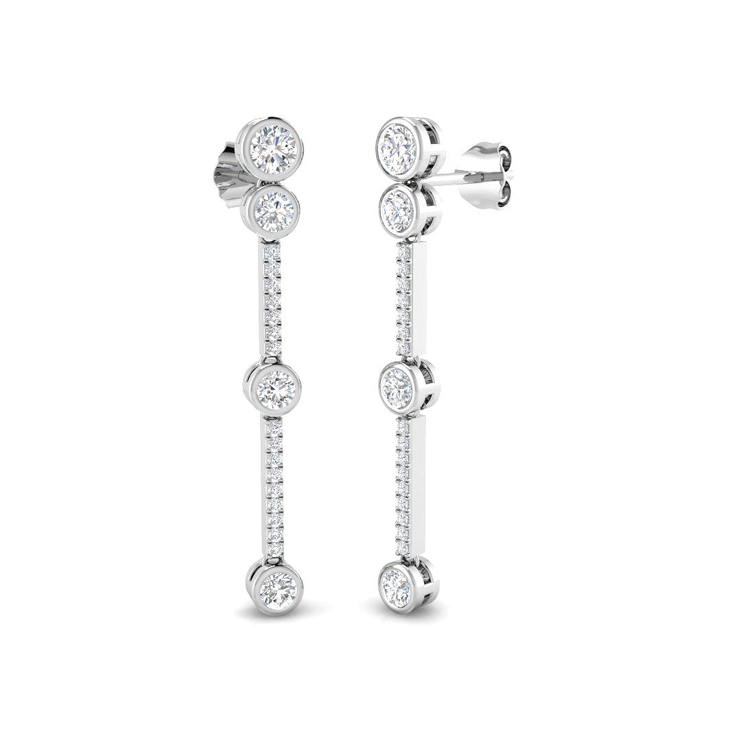 Refined and radiant, these beautiful earrings feature 8 rubover-set diamonds suspended from a claw set diamond drop set in 18ct white gold.